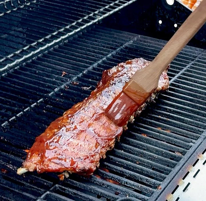 7. To finish, place racks of ribs on hot grill, face down, and brush with sauce. Grill for a few minutes, turn ribs, and brush top with sauce.