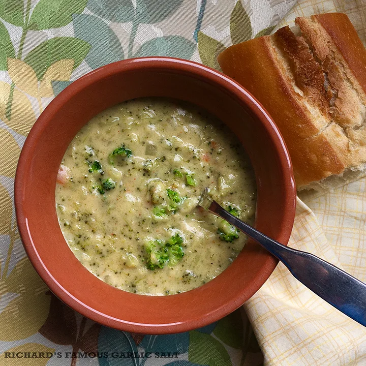 Turn heat to medium high, bring to boil, turn heat to medium low, cover, and cook for about 15-20 minutes, until all veggies are tender. Keep an eye on the pot and add more broth if it evaporates too much--veggies should be nearly covered. Using a hand-masher or fork, lightly mash about 1/2 the veggies, leaving the rest in larger pieces. Add 2 cups of milk, turn heat to medium high, until milk is hot. In a tightly covered container, shake 1/4 C. flour with 1 C. of milk or broth until smooth. Stir flour mixture into hot soup and stir until thickened. Turn to low heat. Add 2 C. shredded cheddar cheese and stir until melted. Add 1 tsp. paprika and about 1/2 tsp. Richard's Famous Garlic Salt, or to taste. Stir well. Ladle hot soup into bowls and serve with warm crusty baguettes. Serves 6.